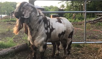 Mad Max, is a Commercial Full blood Borer goat Ram he is the sire of most of our kids this year. He throws strong kids, that gain weight quickly and carry a lot of weight. Additional, he's allowed the does to throw their wonderful dapples. Kids for sale from Max.