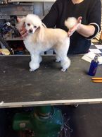 Mighty mouse is sporting a longer hand scissored, poodle cut, with long head, that will have to be banded this is a more high maintenance groom, requires daily combing and monthly baths and comb outs .